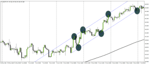 نرى على زوج الدولار ين، رسم توضيحي للقناة السعرية الصاعدة. ونرى مع لمس القيعان فرص للصعود، ومع لمس القمم فرص للهبوط. يمكنك قراءة نماذج المثلثات وشرحها أيضا لتعزيز فهمك بصورة أفضل. فضلا عن شرح نموذج المستطيل الاستمراري الذي يدعم فهم استراتيجيات التداول.