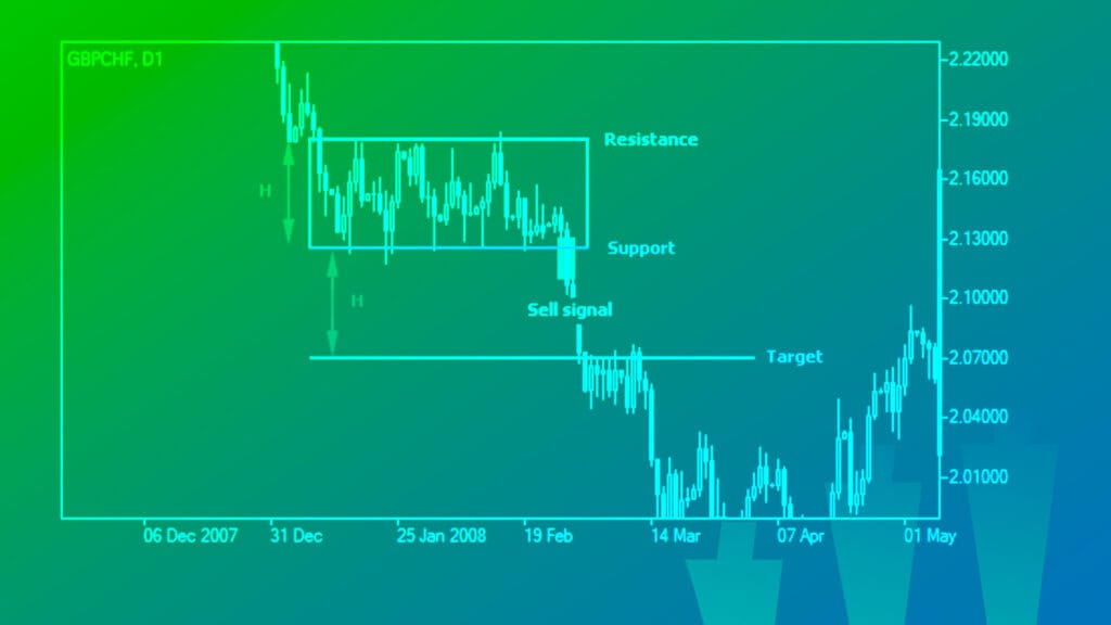 - كسر المستطيل هبوطًا: يشير كسر مستوى الدعم هبوطًا إلى استئناف الاتجاه الهبوطي السابق.